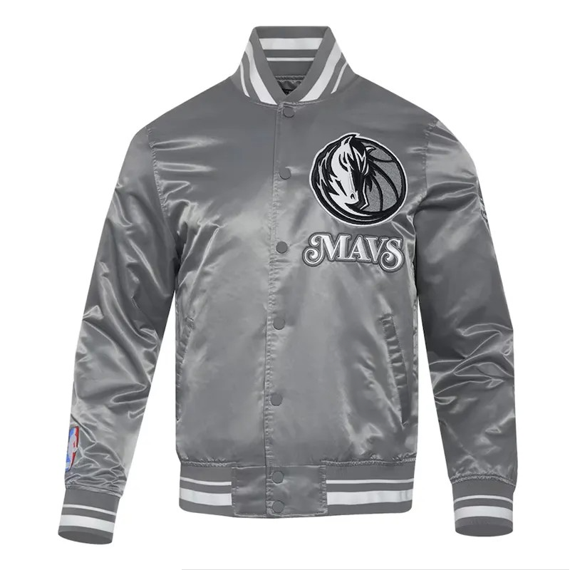 Show off your Mavs pride with this stylish gray satin varsity jacket. Featuring chenille team logos on the chest and back, ribbed trims, and a snap-tab button closure, this unisex jacket blends comfort and street-ready style. Perfect for fans who want to stand out on and off the court.
