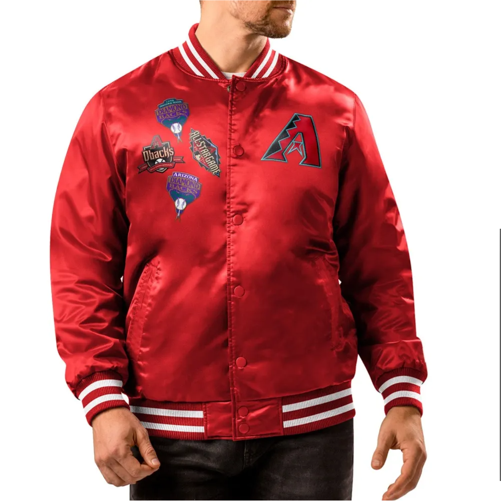 Turn heads and showcase your Arizona Diamondbacks pride with this full-snap red satin varsity jacket. Featuring bold team patches and a sleek, glossy finish, this jacket combines retro athletic style with modern comfort. Designed for true fans, it’s the perfect choice for game days, tailgates, or making a statement in your everyday streetwear.