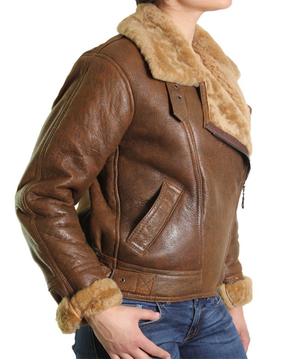 The jacket comes with lapel collar with buckle straps, zipper closure, and two waist pockets. In addition, it also features full-length shearling cuffs, fur shearling inside, and adjustable belts at the waist.