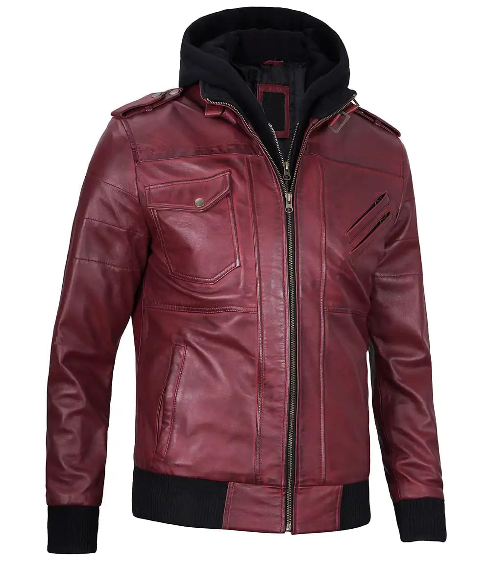 This Mens Maroon Leather Jacket with Removable Hood is a stylish and versatile addition to any wardrobe. Made from high-quality leather, it features a removable hood for added convenience and functionality. With its sleek design and durable construction, this jacket is perfect for any occasion.