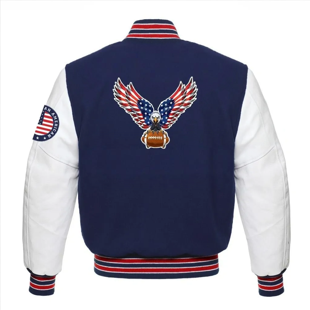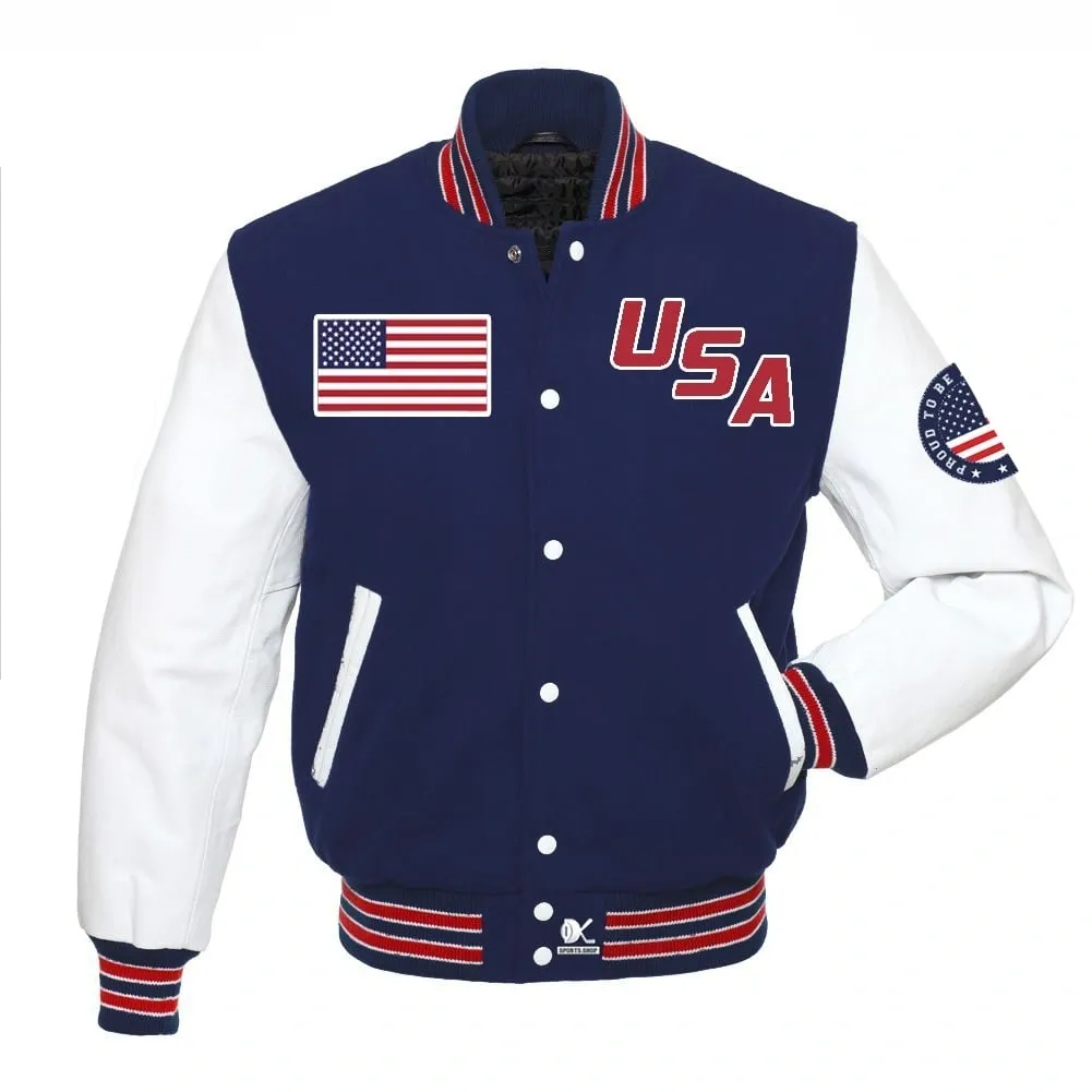This American football sport jacket white sleeves USA varsity jacket features iconic American style with premium materials. Made with high-quality fabric and detailed stitching, this jacket is a timeless piece for any wardrobe. Experience the comfort and style of this classic jacket while showing off your American pride.