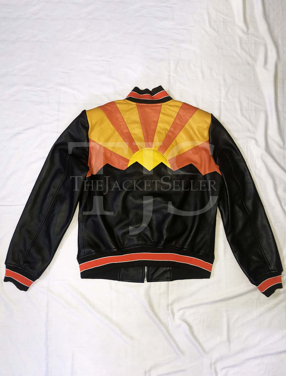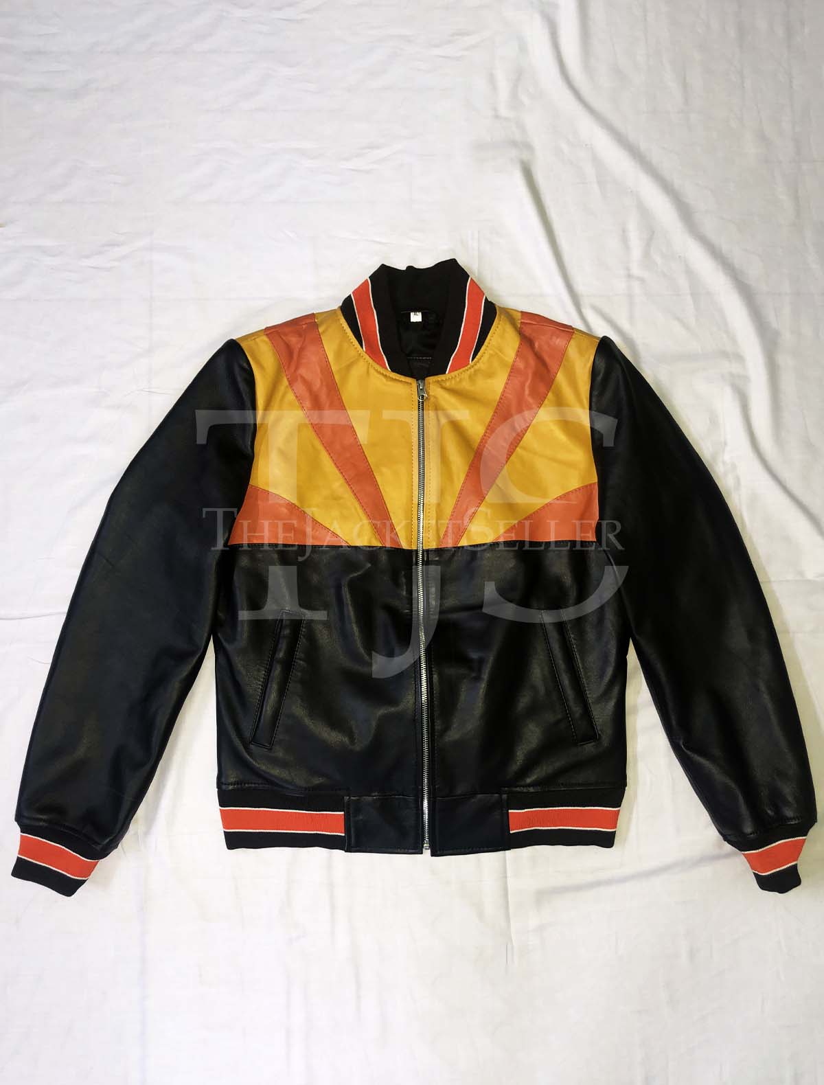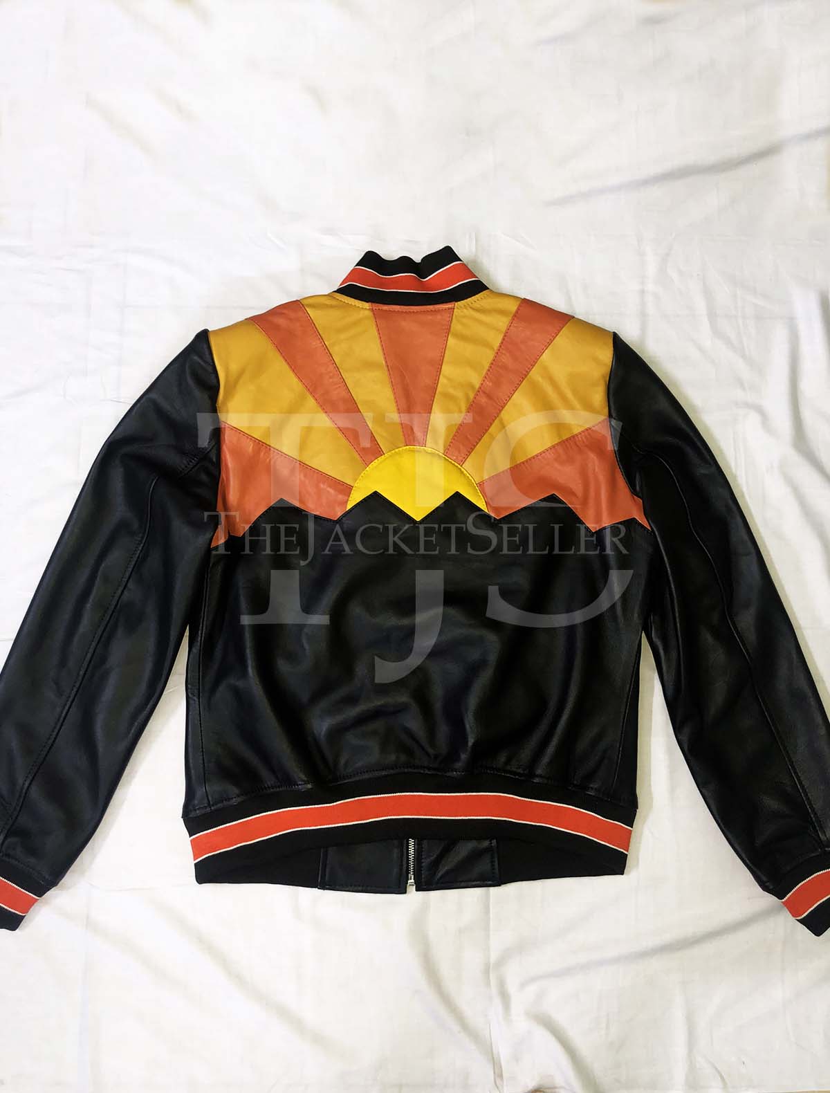 Elevate your style with the Sunrise Leather Jacket, a perfect blend of bold colors and timeless design. Crafted from premium-quality leather, this jacket features a striking sunburst pattern with radiant orange and yellow panels on the front and back, embodying the warmth and energy of a sunrise. The rich black base color on the sleeves and body provides a sophisticated contrast, making the bright colors pop even more.