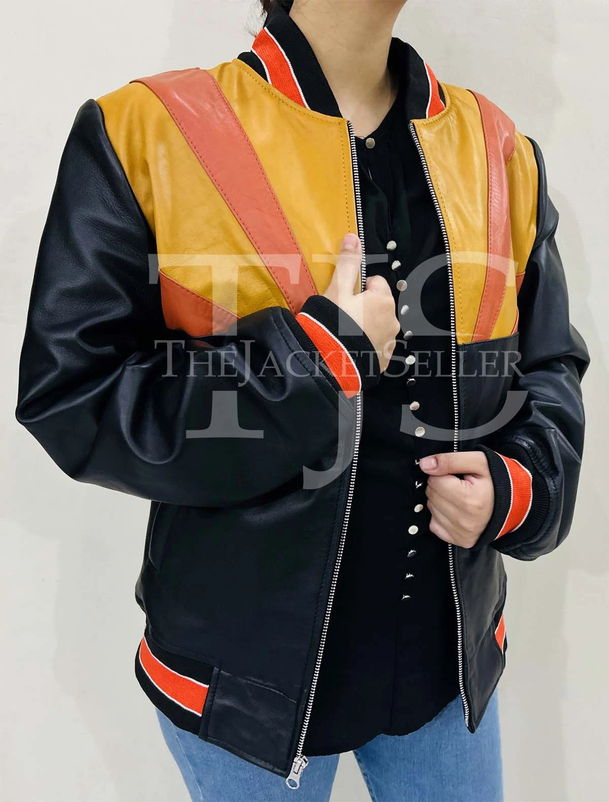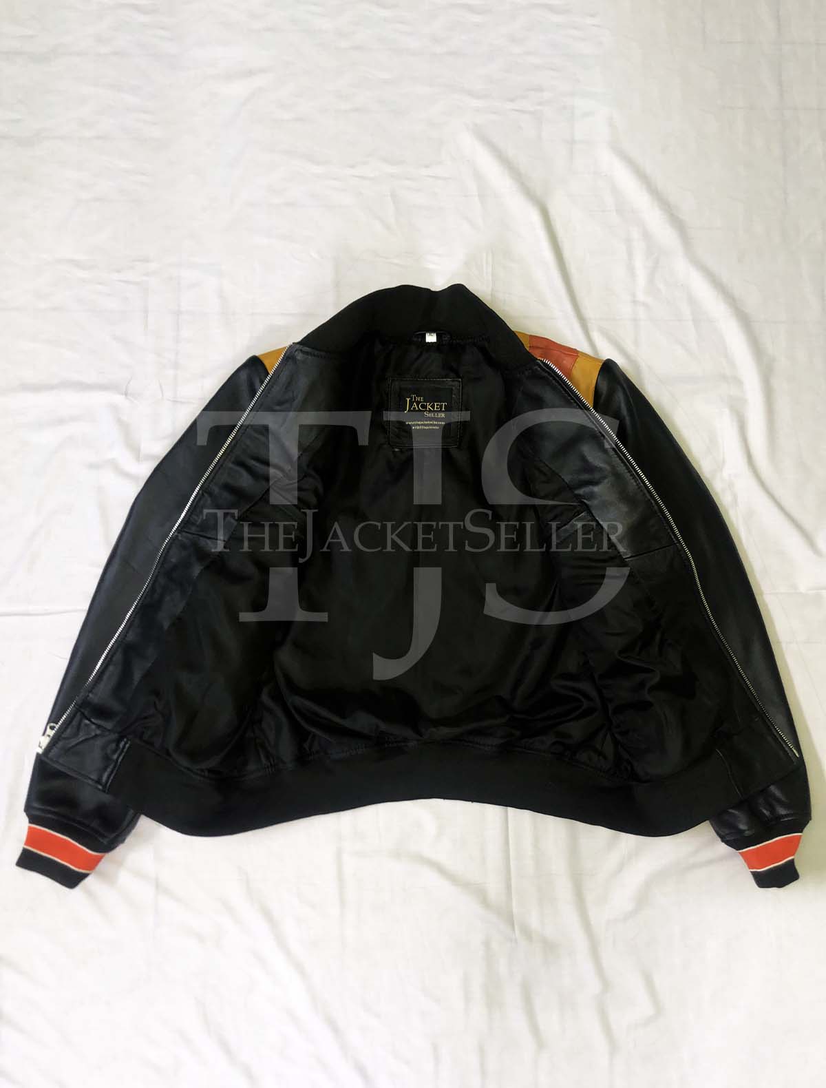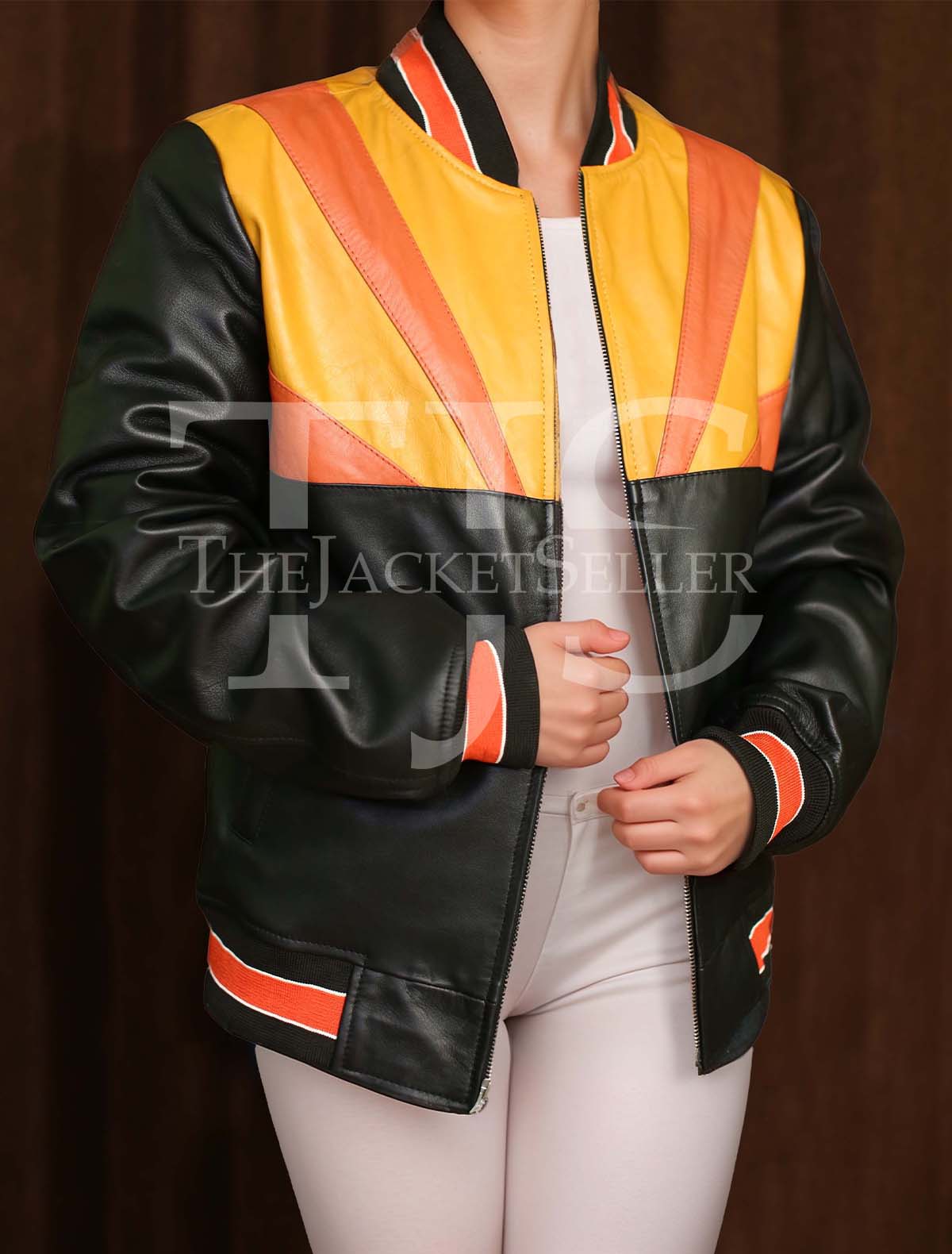 Elevate your style with the Sunrise Leather Jacket, a perfect blend of bold colors and timeless design. Crafted from premium-quality leather, this jacket features a striking sunburst pattern with radiant orange and yellow panels on the front and back, embodying the warmth and energy of a sunrise. The rich black base color on the sleeves and body provides a sophisticated contrast, making the bright colors pop even more.