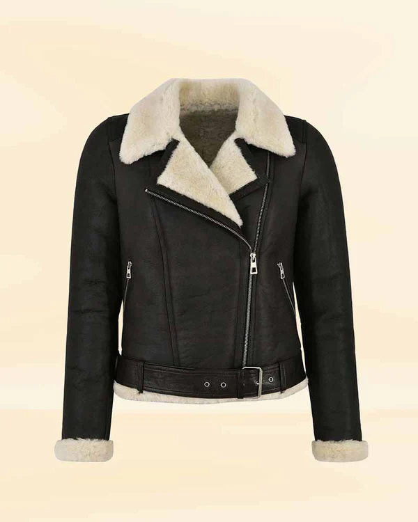 The jacket comes with lapel collar with buckle straps, zipper closure, and two waist pockets. In addition, it also features full-length shearling cuffs, fur shearling inside, and adjustable belts at the waist.